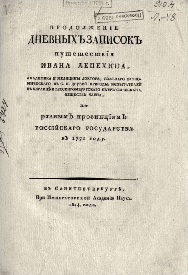 Поленов, В. Краткое жизнеописание И.И. Лепехина // Труды Императорской Российской академии. Ч. II. – Санктпетербург, 1840. – С. 205-215. – Сочинения и переводы И.И. Лепехина: с. 213-215.