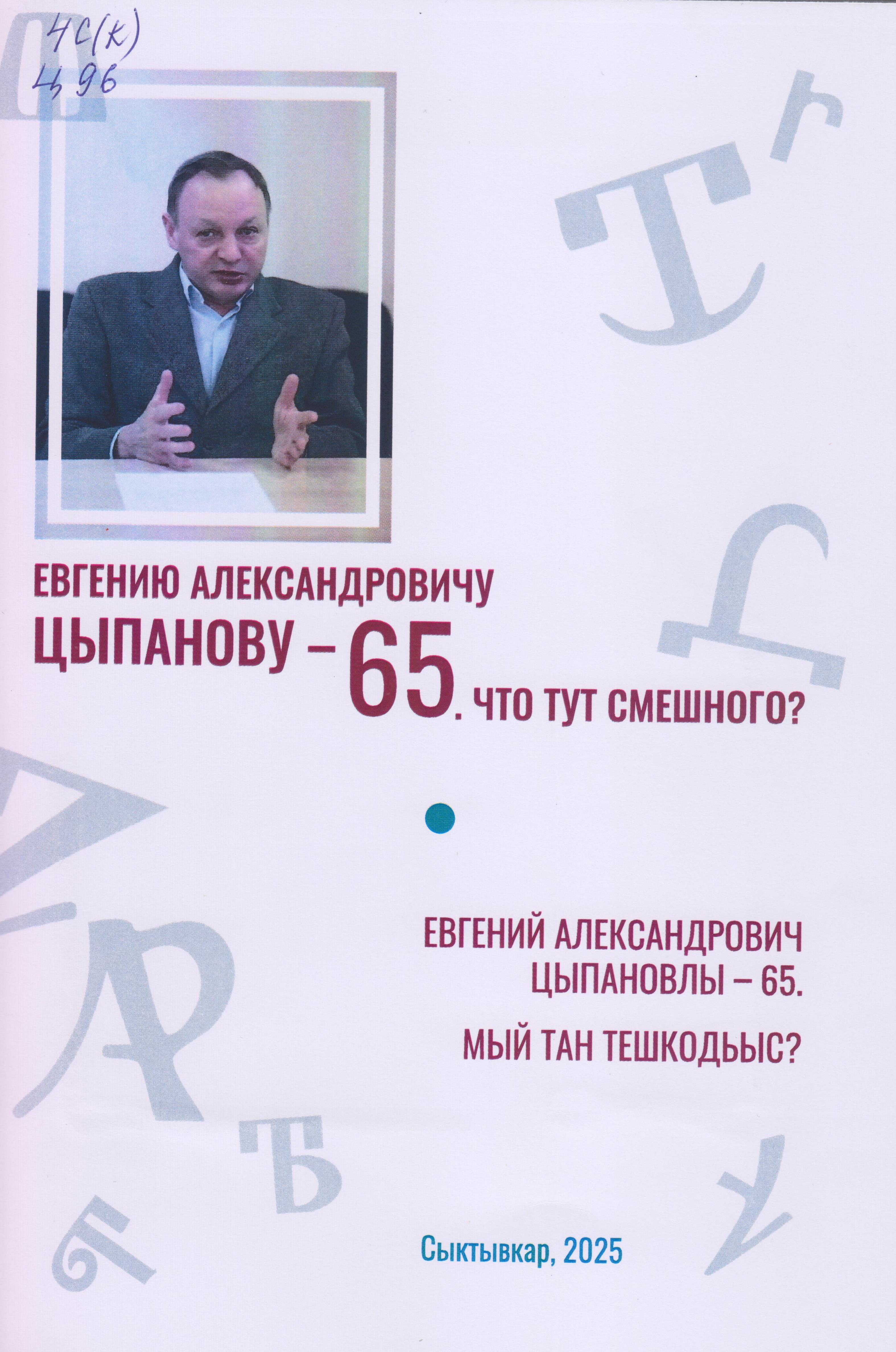 ![]() | 4С(К)/Ц 96 Издание приурочено к 65-летию доктора филологических наук, доцента, главного научного сотрудника сектора языка Института языка, литературы и история ФИЦ «Коми научный центр УрО РАН» Евгения Александровича Цыпанова. В работе представлены краткий биографический очерк, пародии на стихи коми поэтов, юмористические рассказы и сатирические эссе, переводные прозаические произведения. |