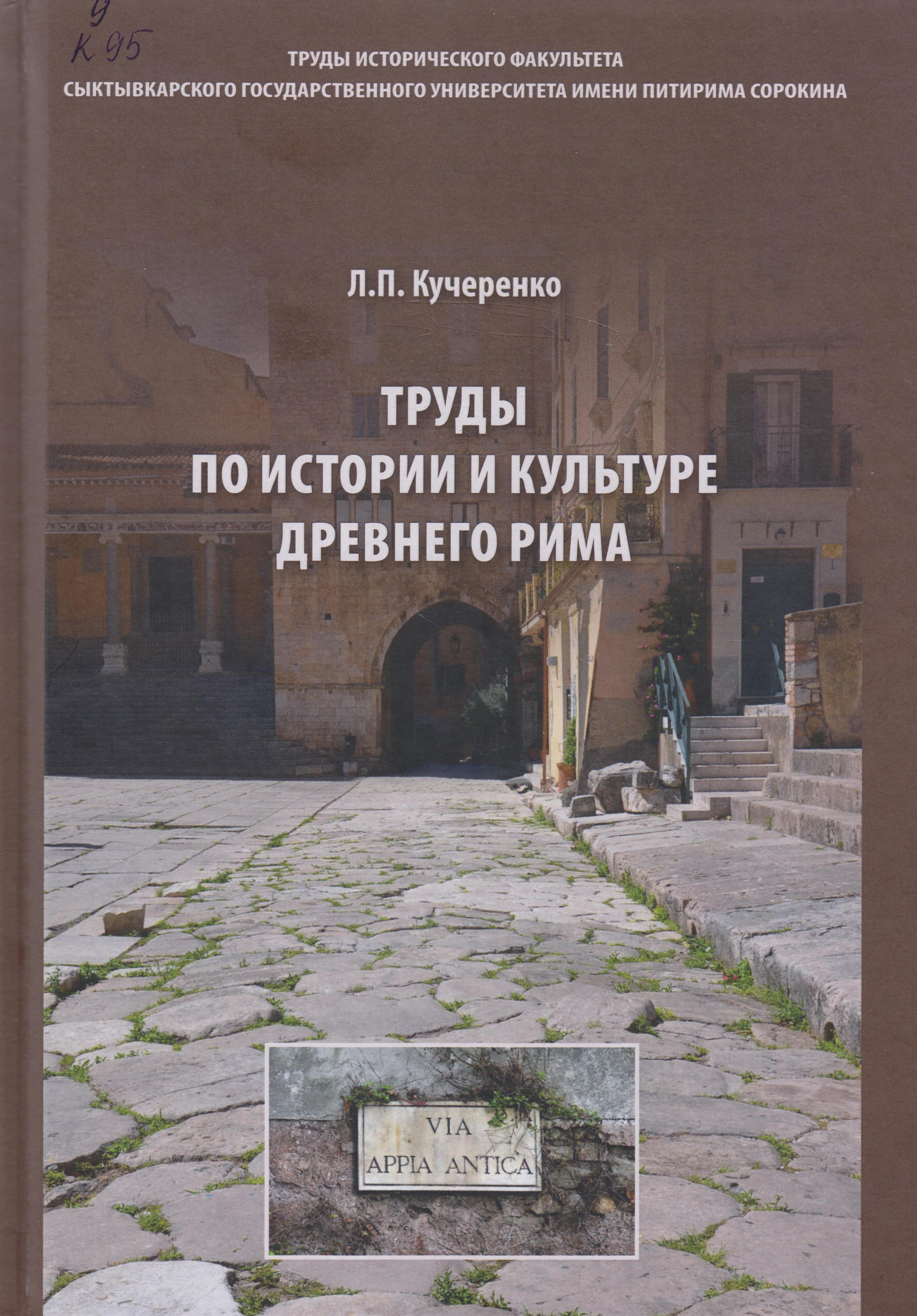 ![]() | 9/К 95 Кучеренко, Л.П. Труды по истории и культуре древнего Рима : Аппий Клавдий Цек: личность и политик в контексте эпохи / Сыктывкарскиий гос. ун-т им. Питирима Сорокина ; сост. и общ. ред. А.А. Павлова. – Москва ; Санкт-Петербург : Центр гуманитарных инициатив, 2024. – 410 с. : ил. – (Труды исторического факультета Сыктывкарского государственного университета имени Питирима Сорокина ; вып. I). – Библиогр.: с. 163-171, с. 398-407 и в подстроч. примеч. Настоящий том открывает серию «Труды исторического факультета Сыктывкарского государственного университета», приуроченную к 50-летию факультета. В первый выпуск серии вошли различные научные труды и учебные пособия, посвящённые истории и культуре Республиканского Рима и опубликованные в период с 1990 по 2010 гг., известного антиковеда Людмилы Прокопьевны Кучеренко, стоявшей у истоков факультета и университета. |